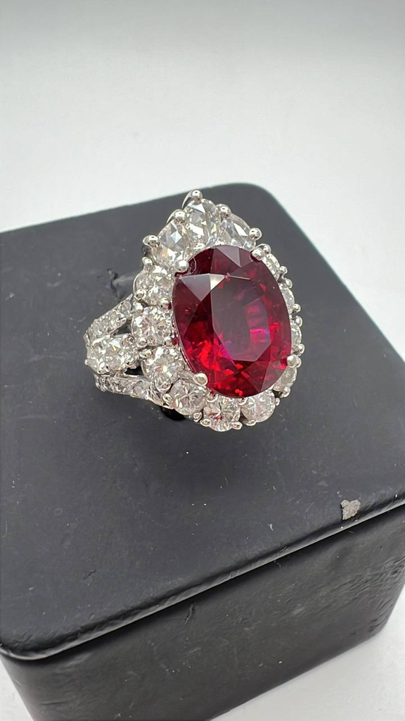 A captivating oval-shaped rubellite, elegantly framed by a halo of sparkling diamonds. The mount partially adorned with additional diamonds, enhancing overall brilliance and elegance