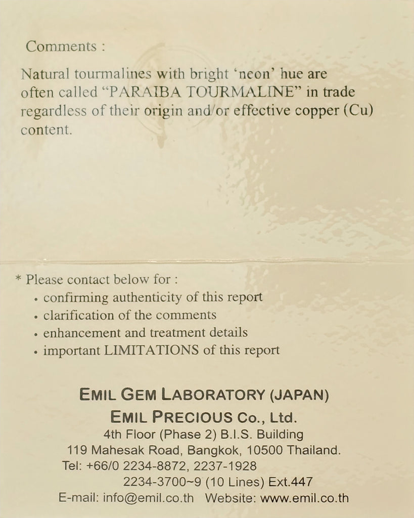 Comments: Natural tourmalines with a bright 'neon' hue are often called "PARAIBA TOURMALINE" in trade regardless of their origin and/or effective copper (Cu) content.