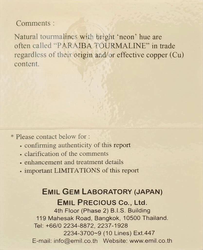 Comments: Natural tourmalines with a bright 'neon' hue are often called "PARAIBA TOURMALINE" in trade regardless of their origin and/or effective copper (Cu) content.