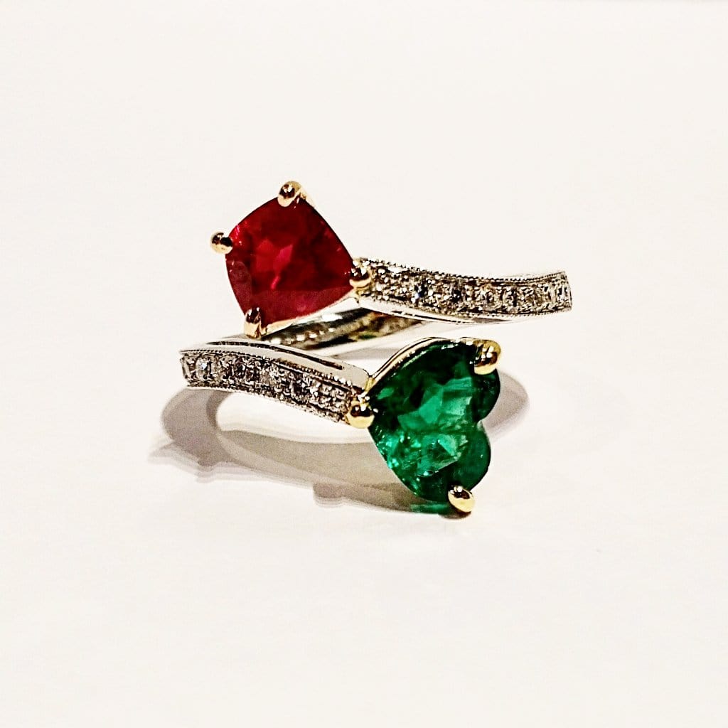 Another unique style is the ruby and emerald are of different shapes. The 1.02ct Zambian emerald is heart shape and the 1.02ct Thai ruby is kite shape. Both are of intense colour.