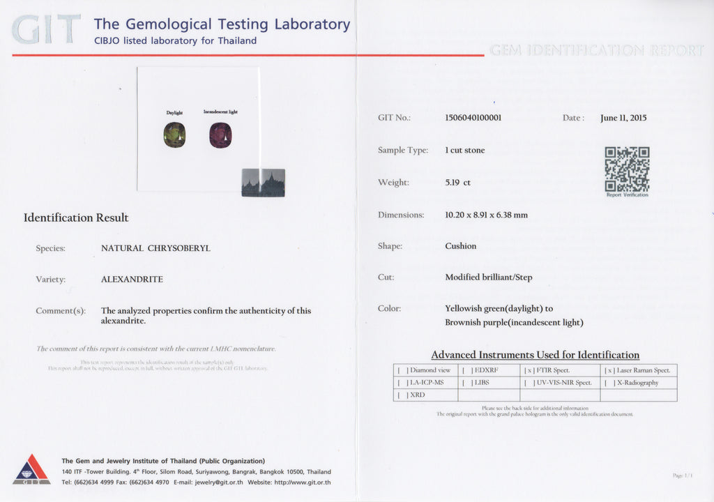Alexandrite is a relatively hard gemstone, it measures 8.5 on the MOH's hardness scale (stainless steel measures 6.5). This 5.19ct Alexandrite displays a very beautiful and unique green colour. It also has a strong colour change.